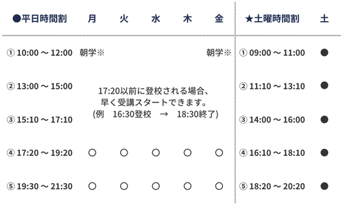 - 土曜日は隔週で開校します。面談や振替、質問補習、自習室利用などにご活用いただけます。